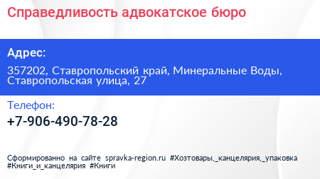 Справедливость, адвокатское бюро по адресу 357202, Ставропольский край, Минеральные Воды, Ставропольская улица, 27 в дальнейшем Организация, размещена в следующих категориях:
