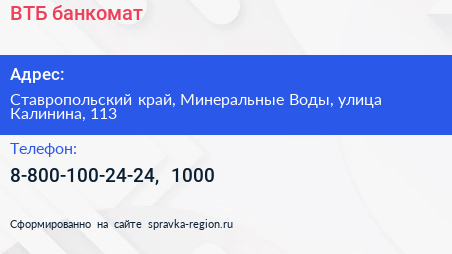 ВТБ, банкомат по адресу Ставропольский край, Минеральные Воды, улица Калинина, 113 в дальнейшем Организация, размещена в следующих категориях: