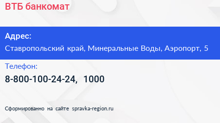 ВТБ, банкомат по адресу Ставропольский край, Минеральные Воды, Аэропорт, 5 в дальнейшем Организация, размещена в следующих категориях: