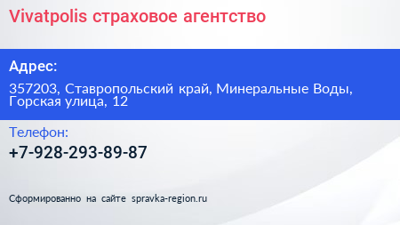 Vivatpolis, страховое агентство по адресу 357203, Ставропольский край, Минеральные Воды, Горская улица, 12 в дальнейшем Организация, размещена в следующих категориях: