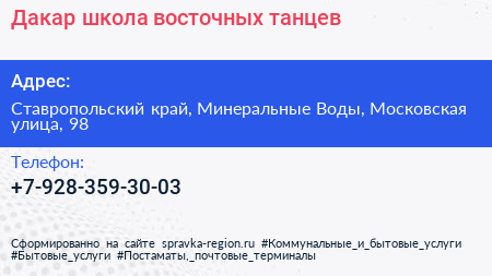 Дакар, школа восточных танцев по адресу Ставропольский край, Минеральные Воды, Московская улица, 98 в дальнейшем Организация, размещена в следующих категориях: