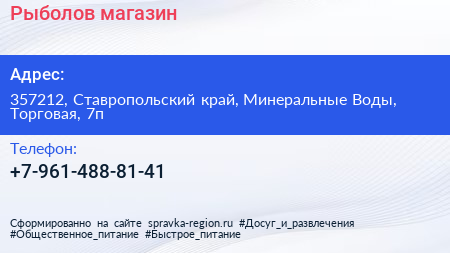 Рыболов, магазин по адресу 357212, Ставропольский край, Минеральные Воды, Торговая, 7п в дальнейшем Организация, размещена в следующих категориях: