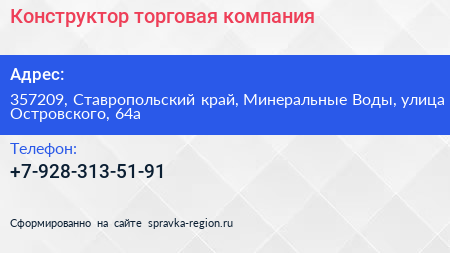 Конструктор, торговая компания по адресу 357209, Ставропольский край, Минеральные Воды, улица Островского, 64а в дальнейшем Организация, размещена в следующих категориях: