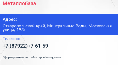 Металлобаза по адресу Ставропольский край, Минеральные Воды, Московская улица, 19/5 в дальнейшем Организация, размещена в следующих категориях:
