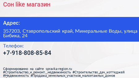 Сон like, магазин по адресу 357203, Ставропольский край, Минеральные Воды, улица Бибика, 24 в дальнейшем Организация, размещена в следующих категориях: