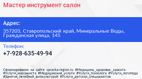Мастер инструмент, салон по адресу 357203, Ставропольский край, Минеральные Воды, Гражданская улица, 145 в дальнейшем Организация, размещена в следующих категориях: