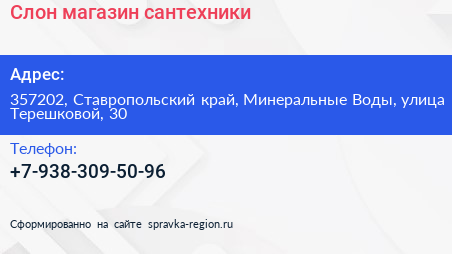 Слон, магазин сантехники по адресу 357202, Ставропольский край, Минеральные Воды, улица Терешковой, 30 в дальнейшем Организация, размещена в следующих категориях: