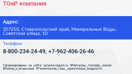 ТОиР, компания по адресу 357210, Ставропольский край, Минеральные Воды, Советская улица, 10 в дальнейшем Организация, размещена в следующих категориях: