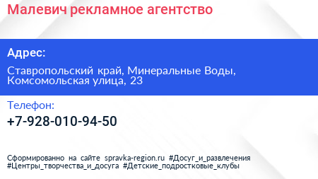 Малевич, рекламное агентство по адресу Ставропольский край, Минеральные Воды, Комсомольская улица, 23 в дальнейшем Организация, размещена в следующих категориях: