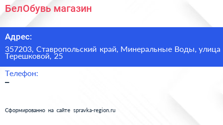 БелОбувь, магазин по адресу 357203, Ставропольский край, Минеральные Воды, улица Терешковой, 25 в дальнейшем Организация, размещена в следующих категориях: