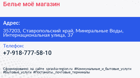 Белье моё!, магазин по адресу 357203, Ставропольский край, Минеральные Воды, Интернациональная улица, 37 в дальнейшем Организация, размещена в следующих категориях: