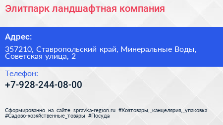 Элитпарк, ландшафтная компания по адресу 357210, Ставропольский край, Минеральные Воды, Советская улица, 2 в дальнейшем Организация, размещена в следующих категориях: