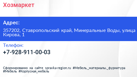 Хозмаркет по адресу 357202, Ставропольский край, Минеральные Воды, улица Кирова, 1 в дальнейшем Организация, размещена в следующих категориях: