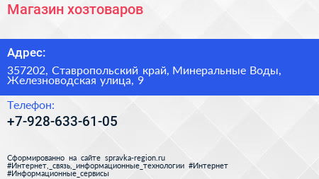 Магазин хозтоваров по адресу 357202, Ставропольский край, Минеральные Воды, Железноводская улица, 9 в дальнейшем Организация, размещена в следующих категориях: