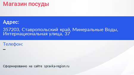 Магазин посуды по адресу 357203, Ставропольский край, Минеральные Воды, Интернациональная улица, 37 в дальнейшем Организация, размещена в следующих категориях: