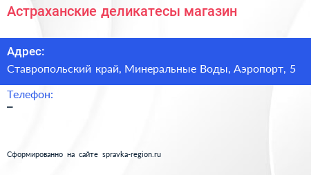 Астраханские деликатесы, магазин по адресу Ставропольский край, Минеральные Воды, Аэропорт, 5 в дальнейшем Организация, размещена в следующих категориях: