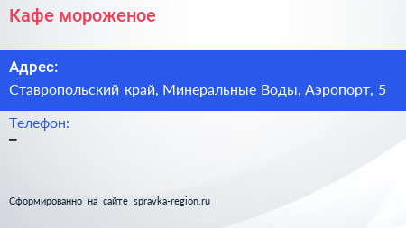 Кафе-мороженое по адресу Ставропольский край, Минеральные Воды, Аэропорт, 5 в дальнейшем Организация, размещена в следующих категориях:
