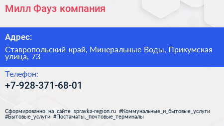 Милл Фауз, компания по адресу Ставропольский край, Минеральные Воды, Прикумская улица, 73 в дальнейшем Организация, размещена в следующих категориях:
