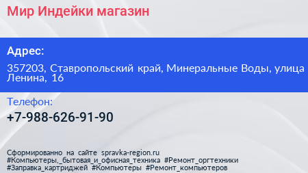 Мир Индейки, магазин по адресу 357203, Ставропольский край, Минеральные Воды, улица Ленина, 16 в дальнейшем Организация, размещена в следующих категориях: