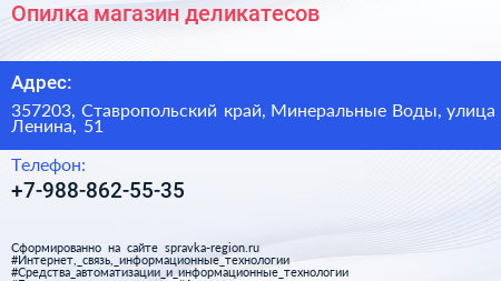 Опилка, магазин деликатесов по адресу 357203, Ставропольский край, Минеральные Воды, улица Ленина, 51 в дальнейшем Организация, размещена в следующих категориях: