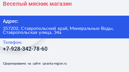 Веселый мясник, магазин по адресу 357202, Ставропольский край, Минеральные Воды, Ставропольская улица, 34а в дальнейшем Организация, размещена в следующих категориях: