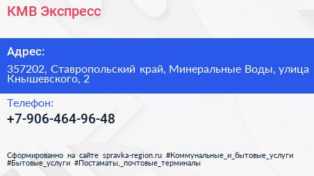 КМВ Экспресс по адресу 357202, Ставропольский край, Минеральные Воды, улица Кнышевского, 2 в дальнейшем Организация, размещена в следующих категориях: