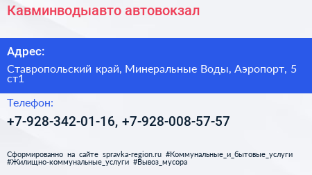 Кавминводыавто, автовокзал по адресу Ставропольский край, Минеральные Воды, Аэропорт, 5 ст1 в дальнейшем Организация, размещена в следующих категориях: