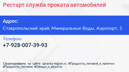 Рестарт, служба проката автомобилей по адресу Ставропольский край, Минеральные Воды, Аэропорт, 5 в дальнейшем Организация, размещена в следующих категориях: