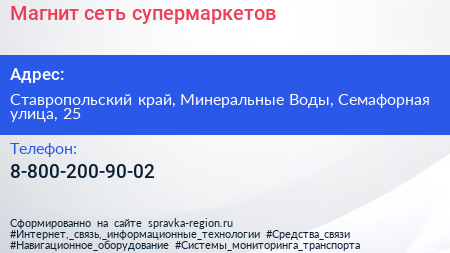 Магнит, сеть супермаркетов по адресу Ставропольский край, Минеральные Воды, Семафорная улица, 25 в дальнейшем Организация, размещена в следующих категориях: