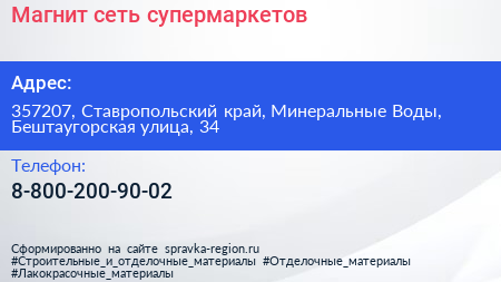 Магнит, сеть супермаркетов по адресу 357207, Ставропольский край, Минеральные Воды, Бештаугорская улица, 34 в дальнейшем Организация, размещена в следующих категориях: