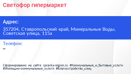 Светофор, гипермаркет по адресу 357204, Ставропольский край, Минеральные Воды, Советская улица, 115а в дальнейшем Организация, размещена в следующих категориях: