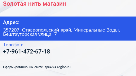Золотая нить, магазин по адресу 357207, Ставропольский край, Минеральные Воды, Бештаугорская улица, 7 в дальнейшем Организация, размещена в следующих категориях: