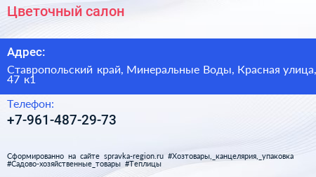 Цветочный салон по адресу Ставропольский край, Минеральные Воды, Красная улица, 47 к1 в дальнейшем Организация, размещена в следующих категориях: