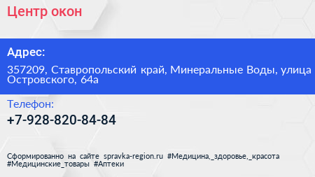 Центр окон по адресу 357209, Ставропольский край, Минеральные Воды, улица Островского, 64а в дальнейшем Организация, размещена в следующих категориях: