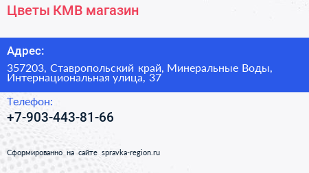 Цветы-КМВ, магазин по адресу 357203, Ставропольский край, Минеральные Воды, Интернациональная улица, 37 в дальнейшем Организация, размещена в следующих категориях: