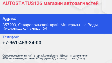 AUTOSTATUS126, магазин автозапчастей по адресу 357203, Ставропольский край, Минеральные Воды, Кисловодская улица, 54 в дальнейшем Организация, размещена в следующих категориях: