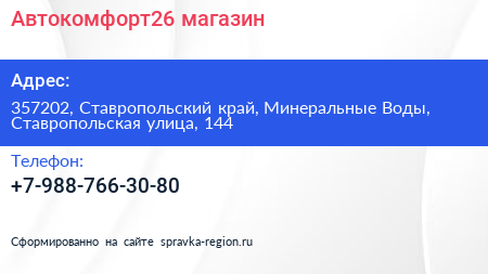 Автокомфорт26, магазин по адресу 357202, Ставропольский край, Минеральные Воды, Ставропольская улица, 144 в дальнейшем Организация, размещена в следующих категориях:
