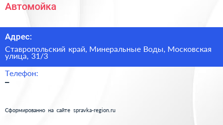 Автомойка по адресу Ставропольский край, Минеральные Воды, Московская улица, 31/3 в дальнейшем Организация, размещена в следующих категориях:
