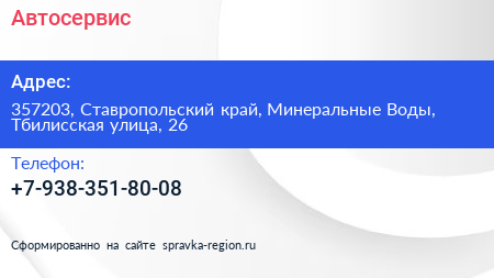 Автосервис по адресу 357203, Ставропольский край, Минеральные Воды, Тбилисская улица, 26 в дальнейшем Организация, размещена в следующих категориях: