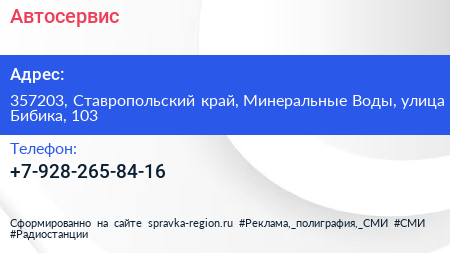 Автосервис по адресу 357203, Ставропольский край, Минеральные Воды, улица Бибика, 103 в дальнейшем Организация, размещена в следующих категориях: