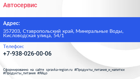 Автосервис по адресу 357203, Ставропольский край, Минеральные Воды, Кисловодская улица, 54/1 в дальнейшем Организация, размещена в следующих категориях: