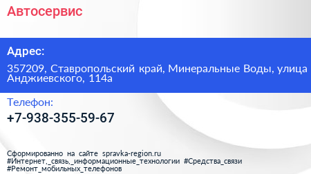 Автосервис по адресу 357209, Ставропольский край, Минеральные Воды, улица Анджиевского, 114а в дальнейшем Организация, размещена в следующих категориях: