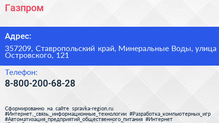Газпром по адресу 357209, Ставропольский край, Минеральные Воды, улица Островского, 121 в дальнейшем Организация, размещена в следующих категориях: