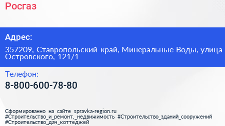 Росгаз по адресу 357209, Ставропольский край, Минеральные Воды, улица Островского, 121/1 в дальнейшем Организация, размещена в следующих категориях: