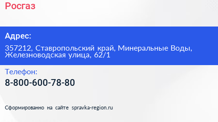 Росгаз по адресу 357212, Ставропольский край, Минеральные Воды, Железноводская улица, 62/1 в дальнейшем Организация, размещена в следующих категориях: