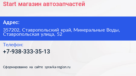 Start, магазин автозапчастей по адресу 357202, Ставропольский край, Минеральные Воды, Ставропольская улица, 52 в дальнейшем Организация, размещена в следующих категориях: