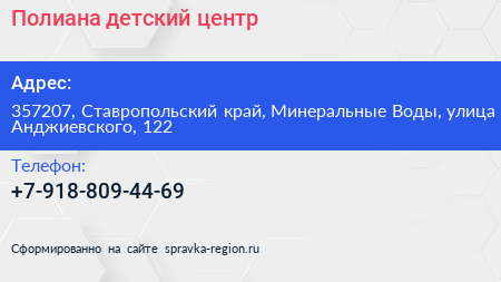 Полиана, детский центр по адресу 357207, Ставропольский край, Минеральные Воды, улица Анджиевского, 122 в дальнейшем Организация, размещена в следующих категориях: