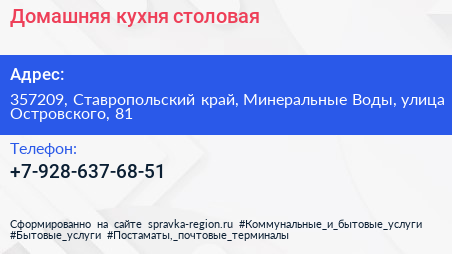 Домашняя кухня, столовая по адресу 357209, Ставропольский край, Минеральные Воды, улица Островского, 81 в дальнейшем Организация, размещена в следующих категориях: