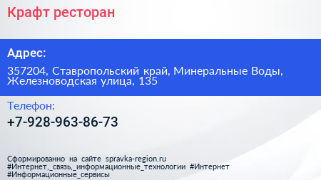 Крафт, ресторан по адресу 357204, Ставропольский край, Минеральные Воды, Железноводская улица, 135 в дальнейшем Организация, размещена в следующих категориях:
