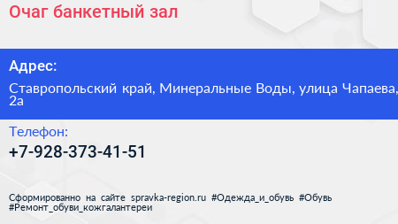 Очаг, банкетный зал по адресу Ставропольский край, Минеральные Воды, улица Чапаева, 2а в дальнейшем Организация, размещена в следующих категориях: